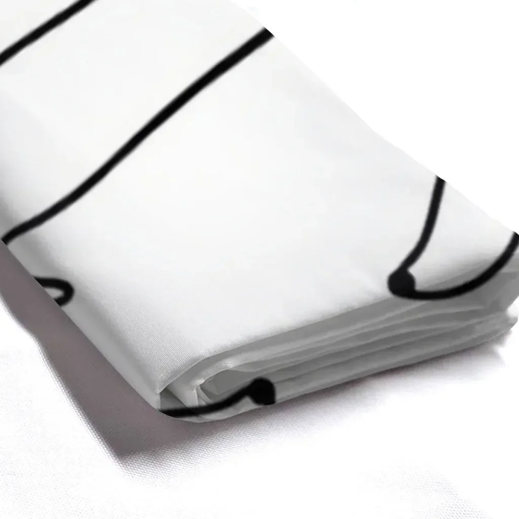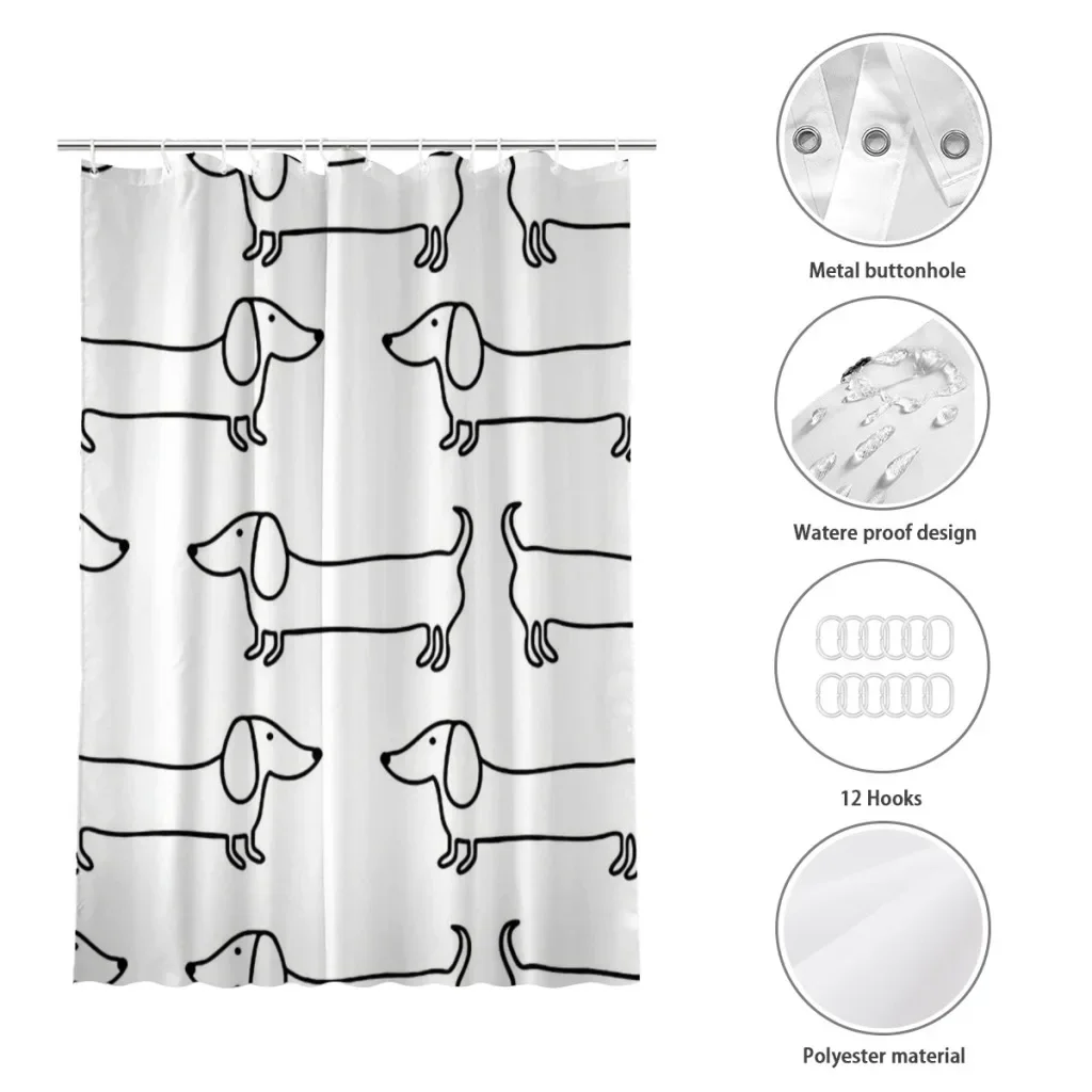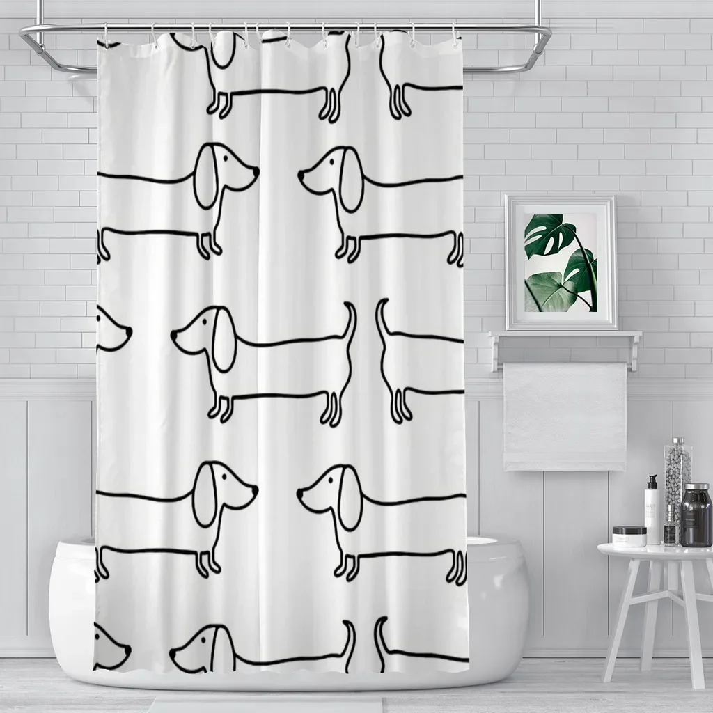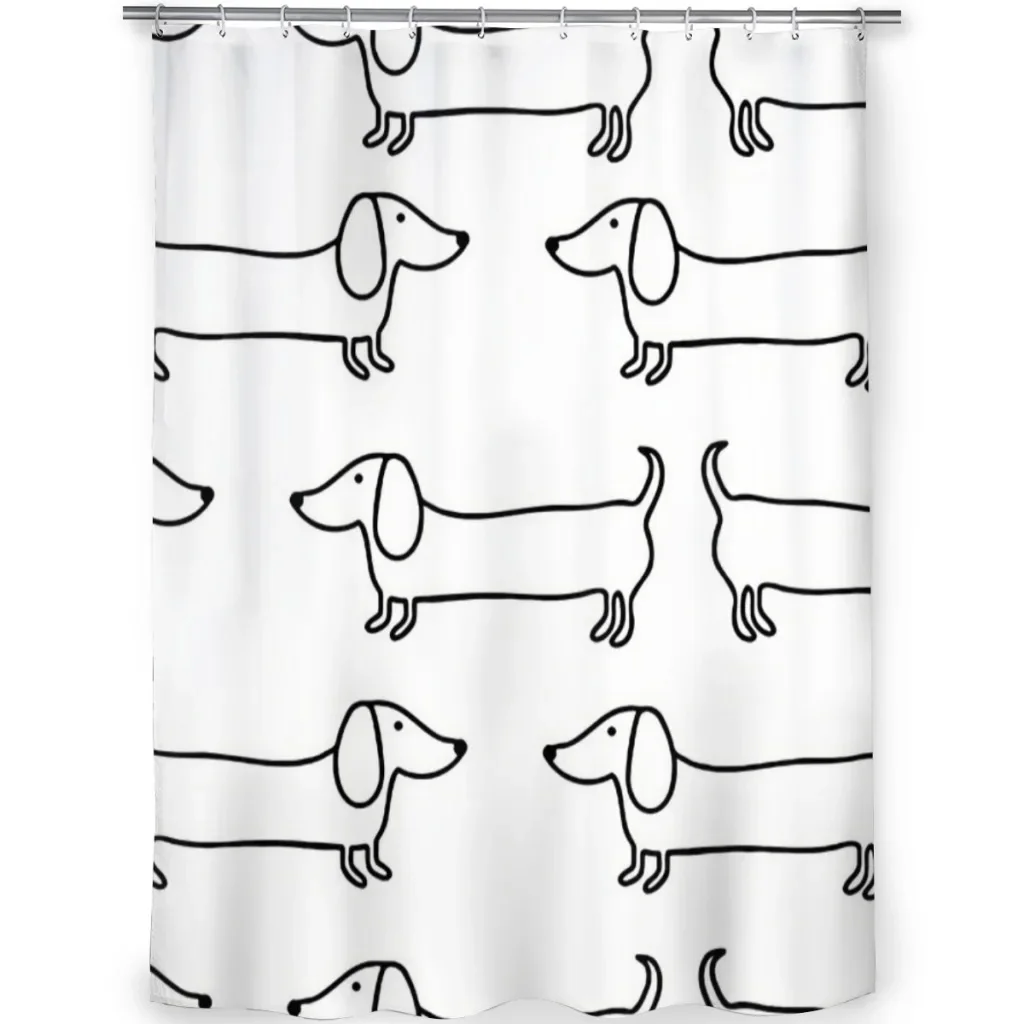 This black and white dachshund shower curtain features a minimalist sausage dog illustration that brings calm charm and subtle humor into your bathroom. Designed with a waterproof polyester fabric, it helps keep your space dry while adding a graphic, modern touch to everyday routines.