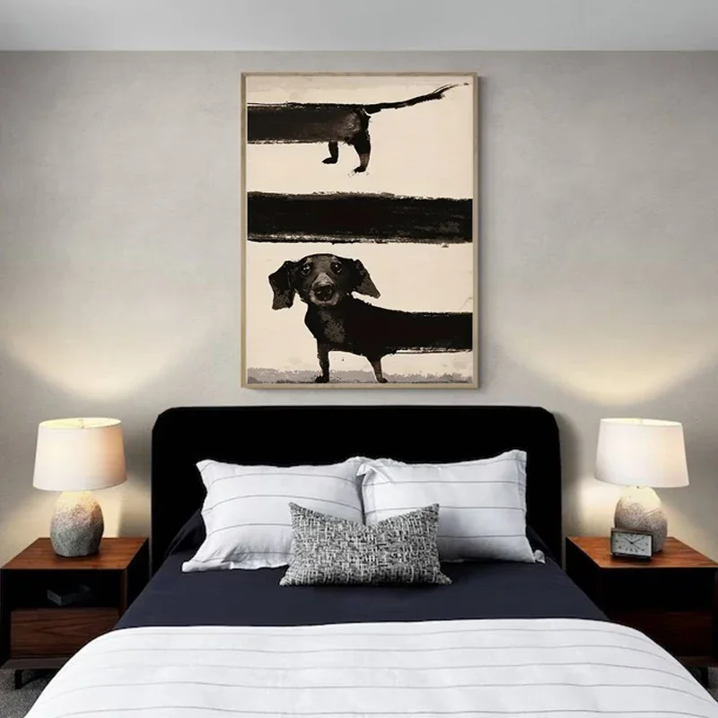 This retro dachshund poster features a charming sausage dog illustration with a warm, minimal aesthetic that fits naturally into modern homes. Printed on quality canvas material, it adds character to living rooms, bedrooms, hallways, or reading corners without overwhelming the space.